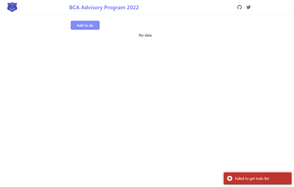 Coba matikan service backend API kita dan refresh halaman aplikasi. Maka kita akan mendapatkan notifikasi dalam bentuk toaster. Notifikasi semacam ini berguna untuk memberi user info apabila terjadi masalah pada aplikasi kita.