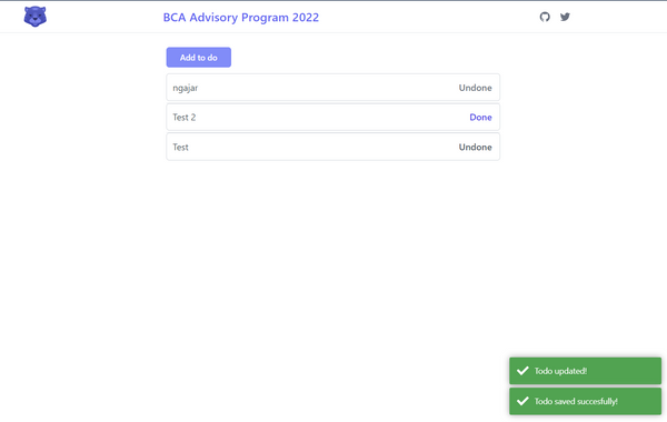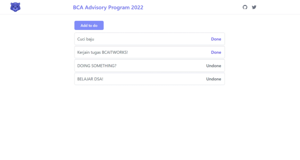 Aplikasi yang kita buat akan dapat melakukan inquiry data to-do yang sudah kita tambahkan, terdapat form yang dapat digunakan untuk menambahkan data to-do, serta toggle pada setiap data to-do untuk mengubah status dari suatu to-do item.